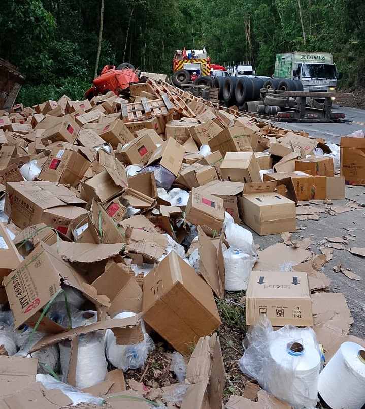 Uma carreta transportando novelos de algodão tombou no km 75 da BR 262, em Domingos Martins, por volta das 16h30 dessa quarta-feira (14). A carga ficou espalhada na pista, interrompendo, parcialmente, o trânsito na rodovia federal, que ficou no sistema pare/siga.