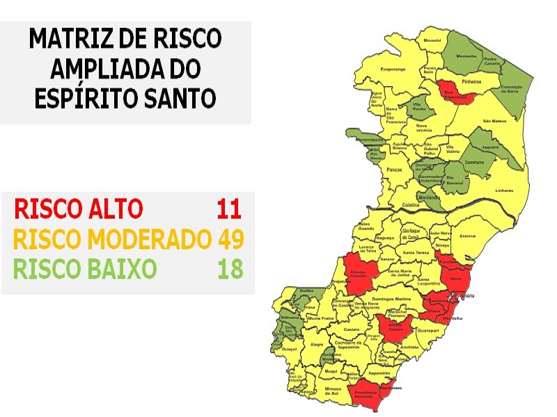 Desde ontem, domingo (24), passa a valer o novo Mapa de Gestão de Risco do novo coronavírus no Espirito Santo. Na nova avaliação, 11 cidades estão no risco alto (vermelho), entre elas Afonso Cláudio e Alfredo Chaves. 49 municípios apresentam risco moderado (amarelo). Nessa classificação estão as cidades que compõem a região Serrana, entre elas Venda Nova do Imigrante. 18 municípios estão no risco baixo (verde).