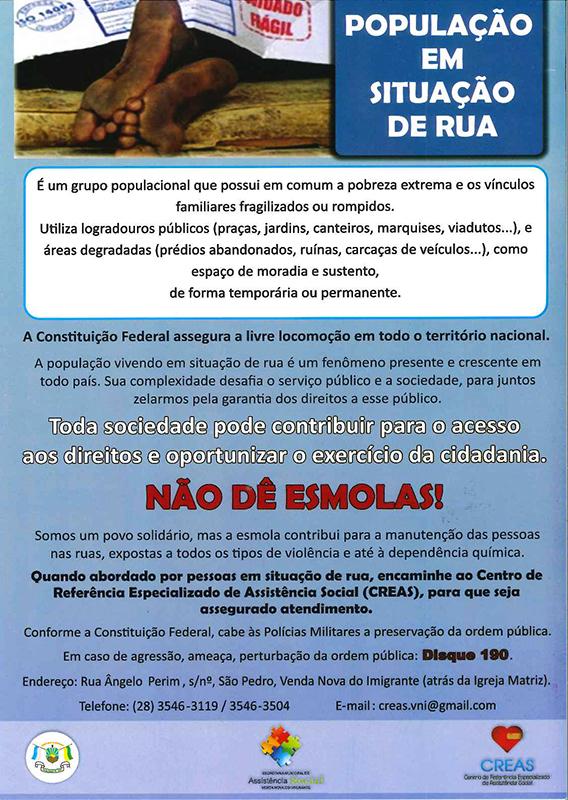 Por isso, é importante que a comunidade vendanovense mude seus hábitos e, em vez de esmolas, encaminhe essas pessoas para o Creas. Assim, a Prefeitura poderá contribuir e auxiliar nas necessidades de cada uma. O telefone do Creas para mais informações é o (28) 3546-3119. Lembre-se: se você presenciar situações que envolvam atos contra a lei, acione a Polícia Militar pelo telefone 190.