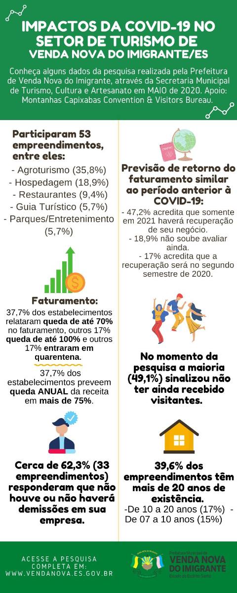 A Prefeitura de Venda Nova do Imigrante, por meio da Secretaria Municipal de Turismo, Cultura e Artesanato, realizou em maio deste ano uma pesquisa online para avaliar os impactos da Covid-19 no Setor de Turismo do Município. O levantamento foi composto por 18 tópicos e contou com a participação de 53 empreendimentos, em sua maioria ligados ao agroturismo (35,8%), hospedagem (18,9%) e restaurantes (9,4%). Uma grande parcela, 39,6%, sinalizou ter mais de 20 anos de mercado.